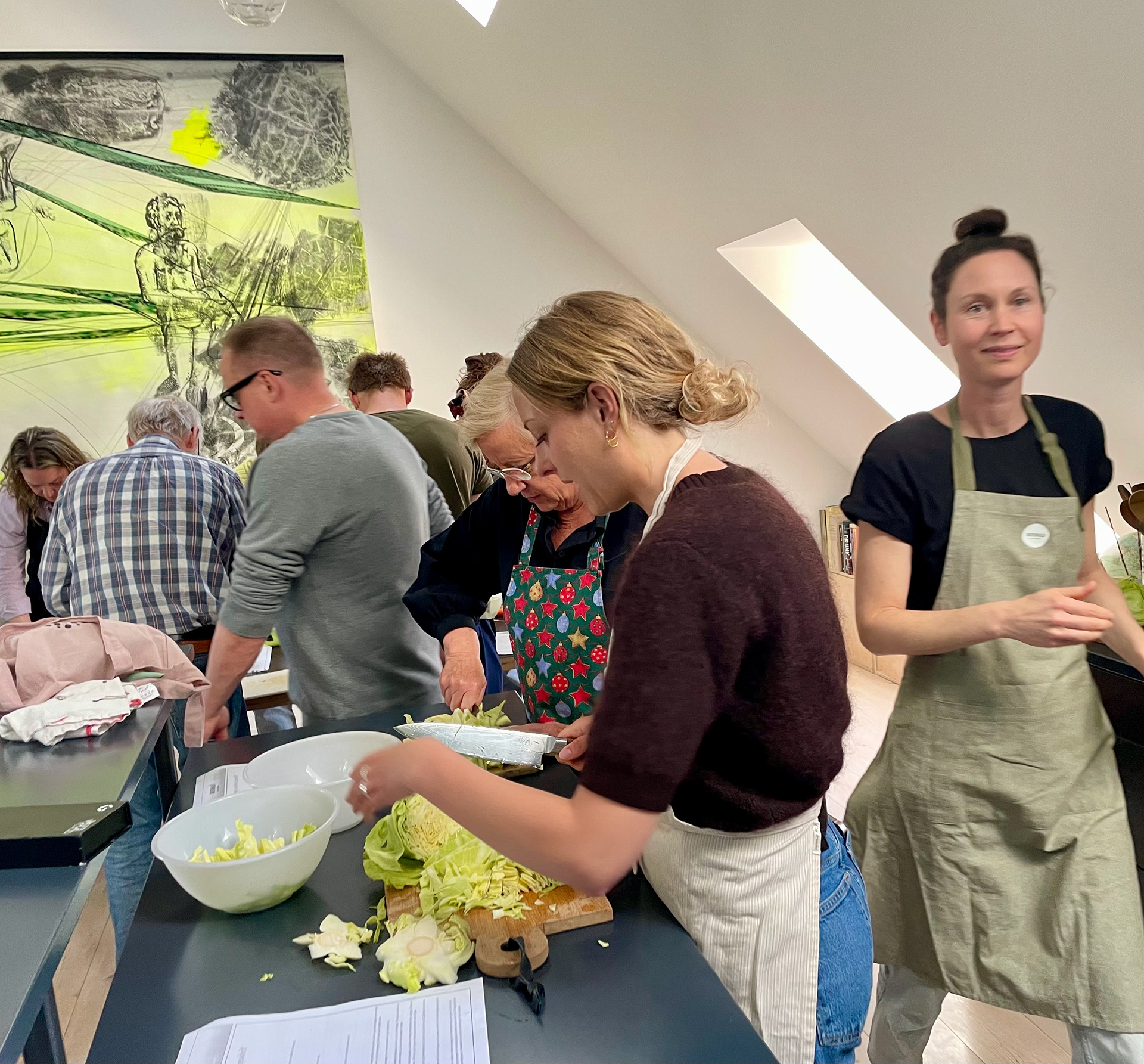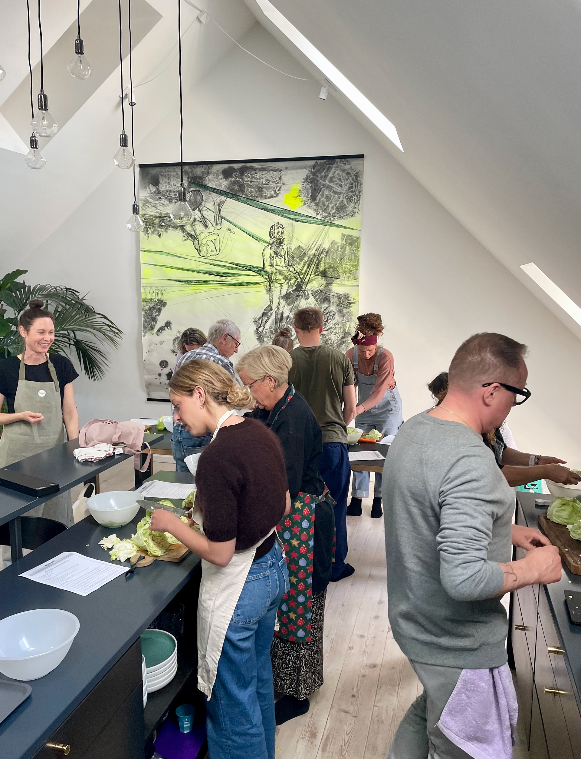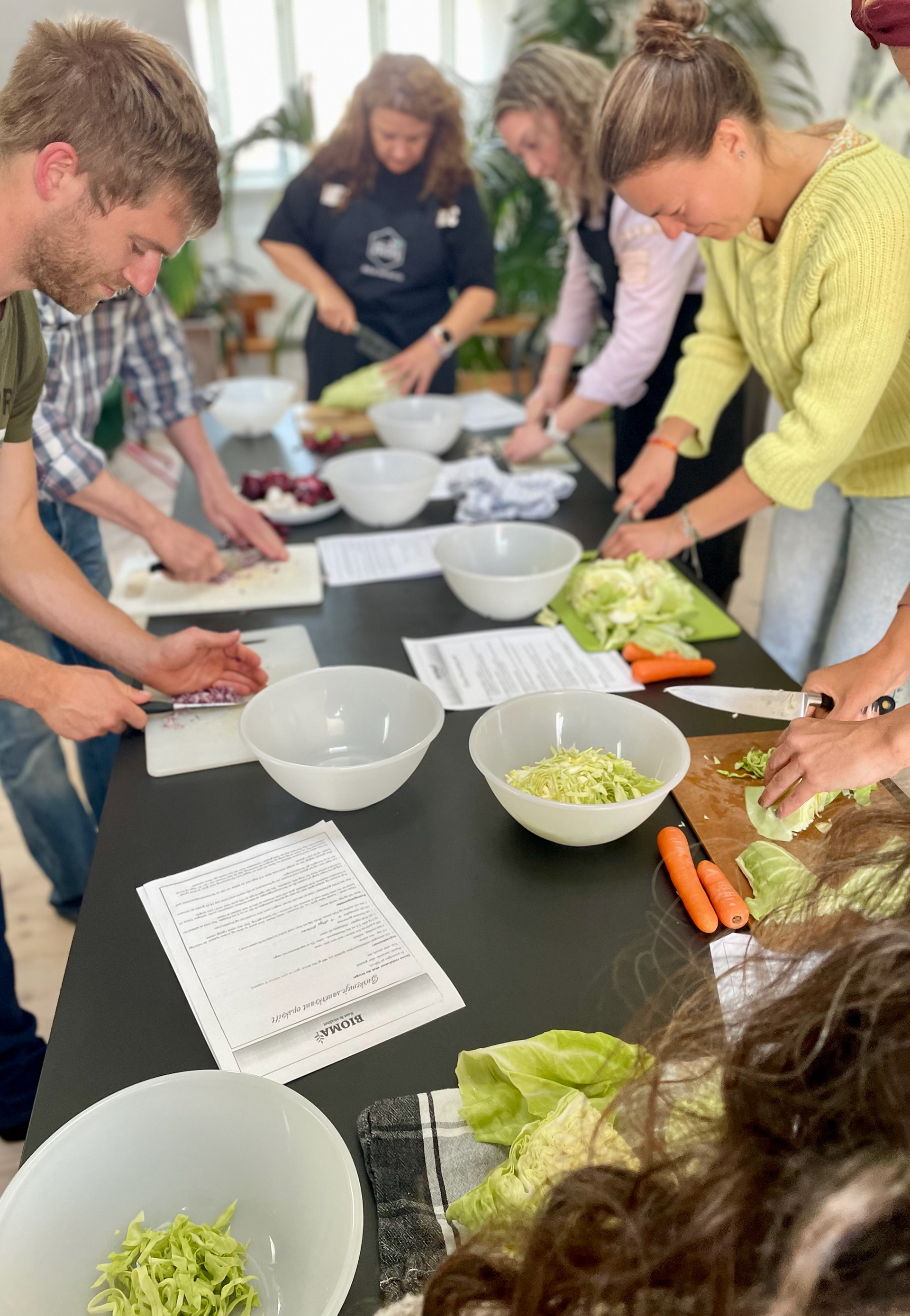 Vi starter workshoppen med et spændende oplæg om hvad tarm-mikrobiomet er for en størrelse, hvad det betyder for vores helbred, hvad det vil sige at fermentere og hvordan vi kan støtter vores tarmbakterier ved at spise fermenteret mad. Dernæst gennemgår vi alt det praktiske og laver sammen en sauerkraut.